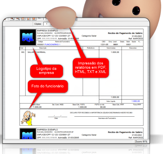 Se podemos citar um ponto forte na Folha de pagamento-DQL é a variedade e apresentação dos relatórios do sistema. O holerite (contracheque), por exemplo, é um documento detalhado e completo, onde se pode imprimir o logotipo da empresa e a foto do funcionário. Mas não é só isso. Todos os relatórios podem ser gerados em PDF, HTML, XML e TXT. Dessa forma você pode enviar os documentos via e-mail facilmente. Sem programas adicionais. Mas o melhor é que não é necessário utilizar programas de e-mail pra isso. O envio da folha de pagamento e do holerite é feito direto do programa. Sem intermediários. E o sistema ainda oferece o relatório da folha de pagamento em formato grade. Um formato exclusivo da nossa Folha de pagamento. Permitindo, através do resumo da folha, a integração com o nosso sistema contábil. Você não vai precisar lançar os movimentos gerados pelo folha de pagamento na contabilidade. A integração existe e é feita com alguns cliques de mouse. Tudo no sistema visa a rapidez e praticidade. Não se esqueça que fazemos sistemas desde 1992 ! Você pode confiar.